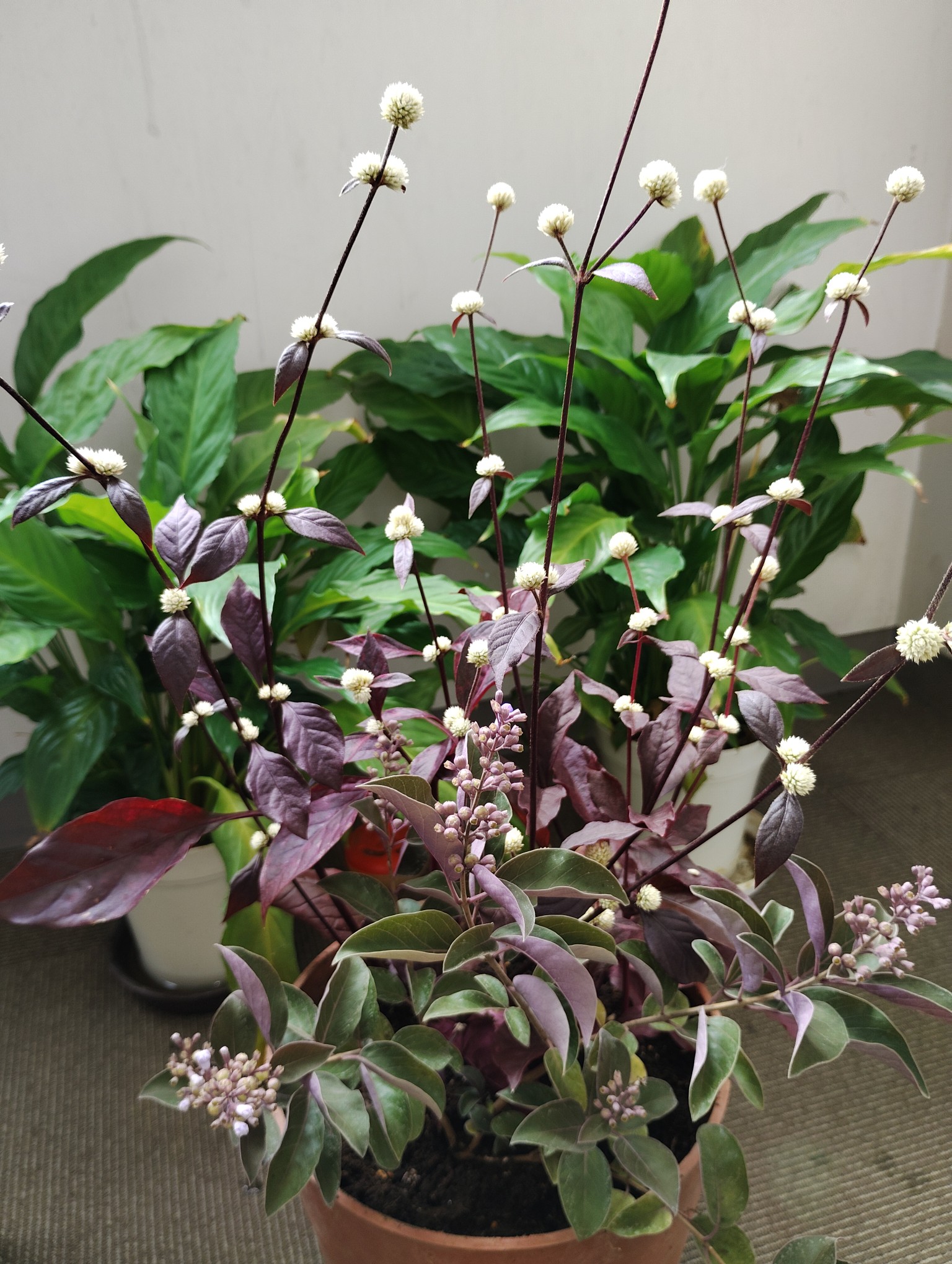赤黒い葉っぱに白いポンポンとした花が付いている「赤葉センニチコウ」です。