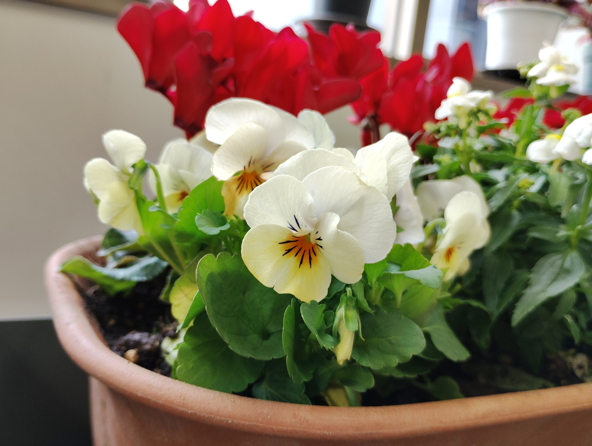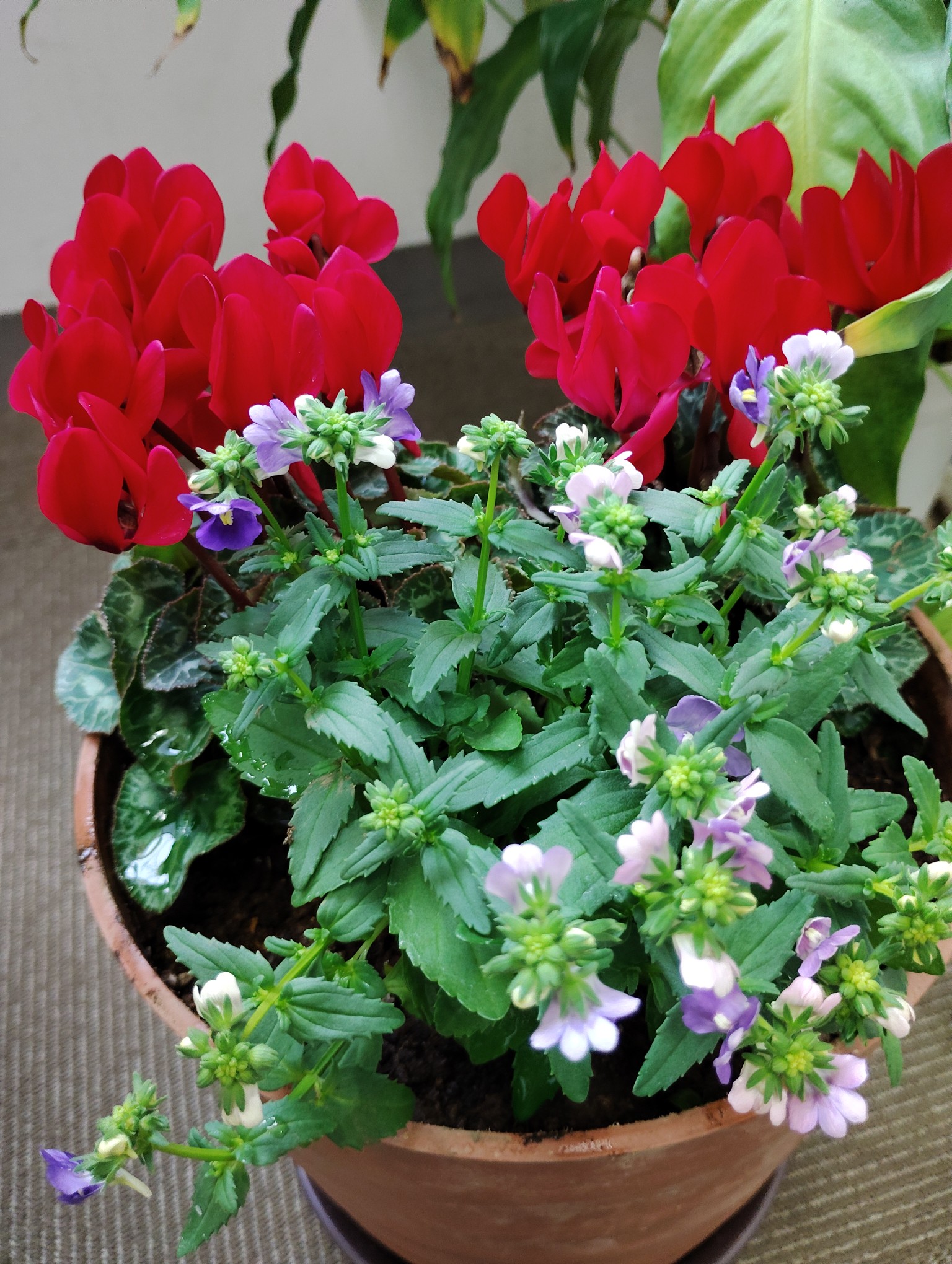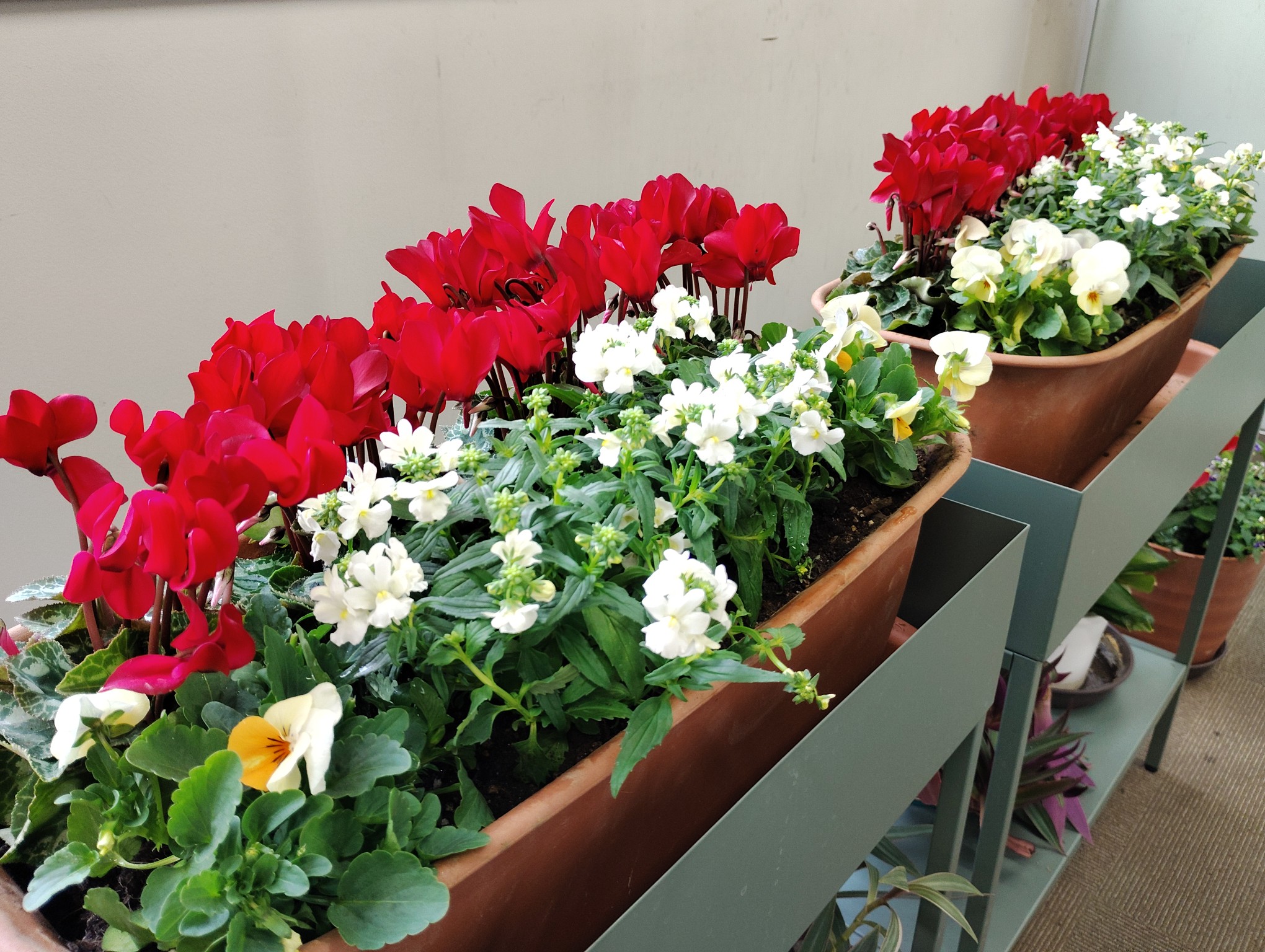 プランターの後ろ側の真っ赤な子は「シクラメン」です。