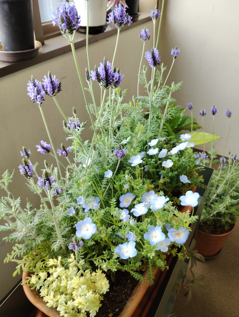 プランター前列の青い花はネモフィラ。